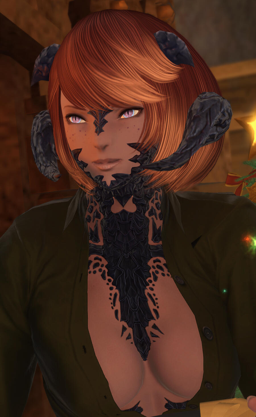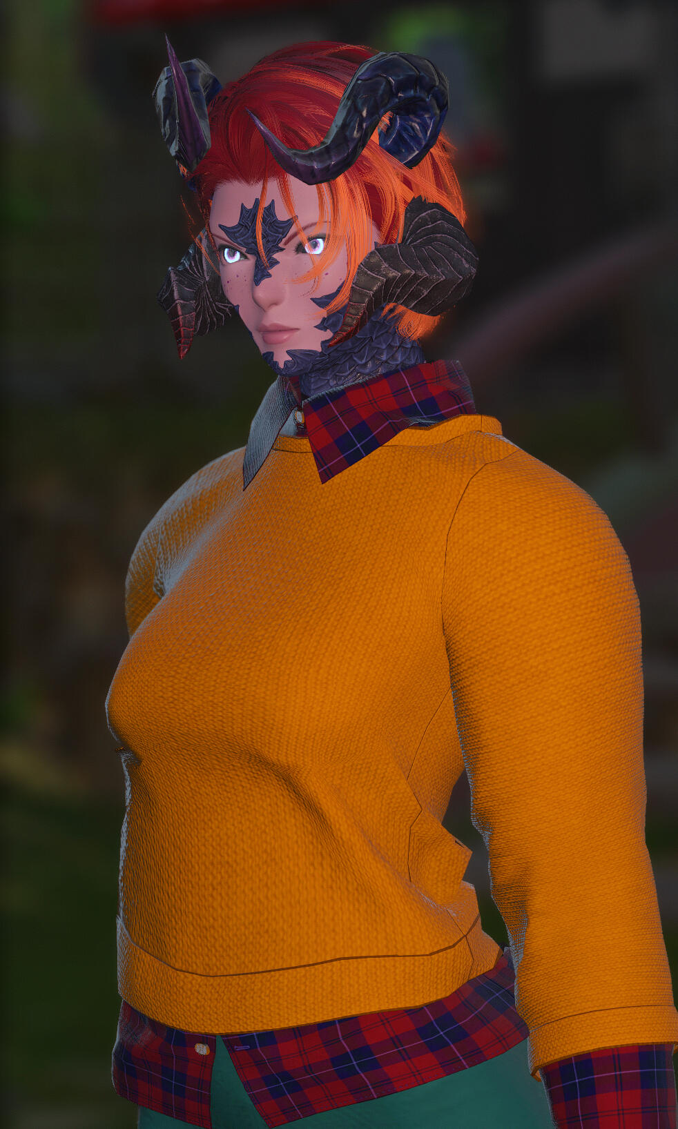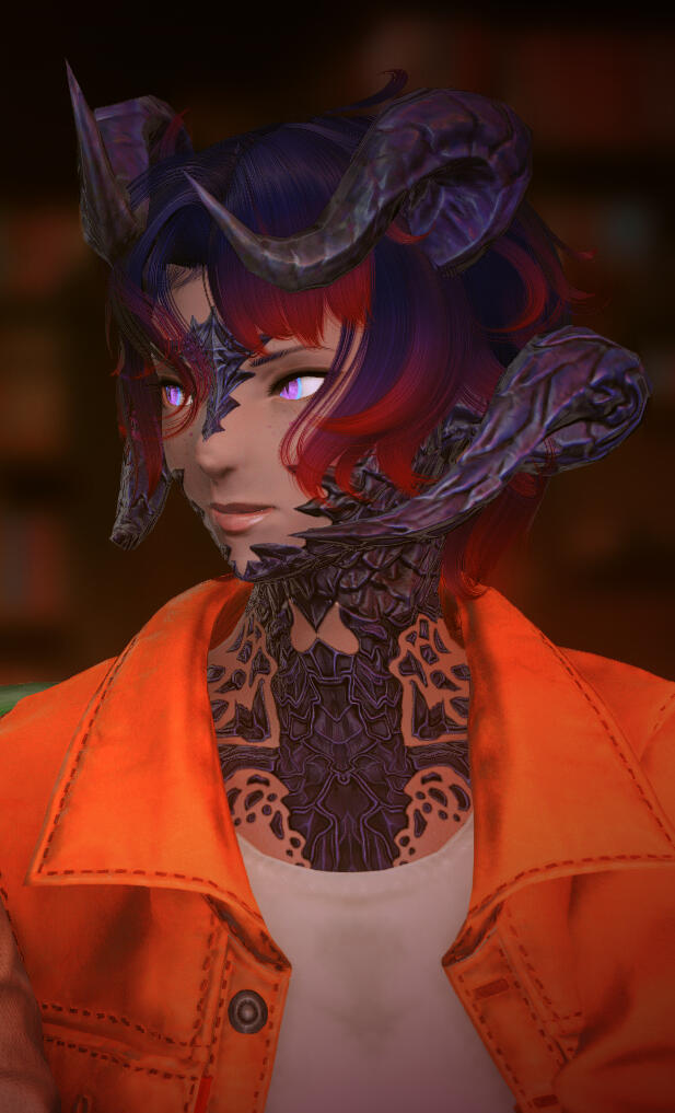 SCALES | dark, shining indigo and far heavier than most Au Ra, covering the majority of her body.
