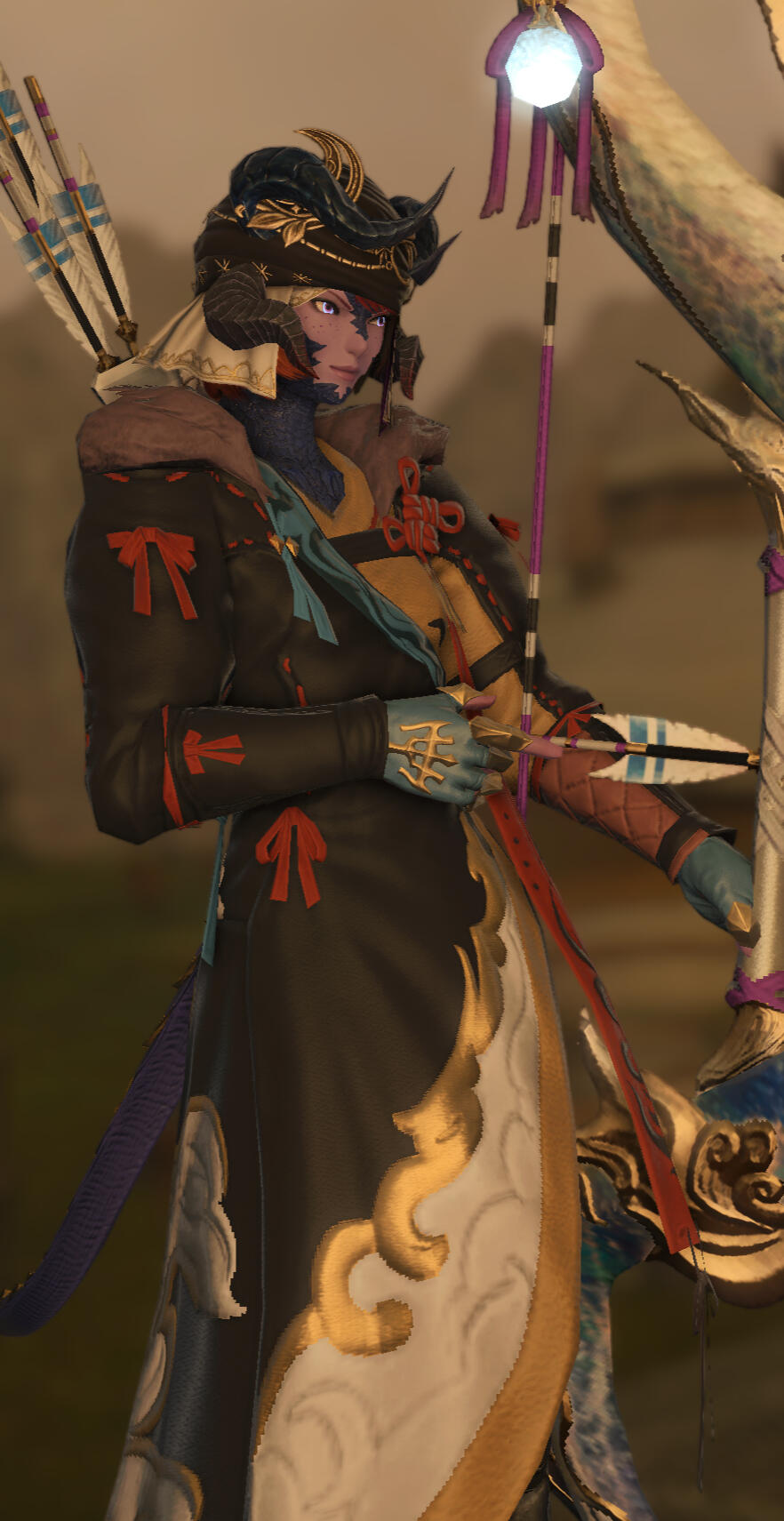 Born deep in the Tail Mountains, Mun spent her childhood learning how to hunt and climb, ultimately becoming as a young adult one of greatest hunters of the Khatayins, able to take down any prey set to her - whether animal, or Spoken. In the manner of the Steppe Mun was often cruel and dismissive of those outside her tribe, and although she did manage to form a few friendships with others, she was often quite alone, and very content in her solitude.Things changed, however, after the Sixth Umbral Calamity. The meteor showers which accompanied the fall of Dalamud awakened the Echo in Mun, a power she could not previously access. While her manifestation was relatively weak, there was no one in her tribe who could help her learn to manage it, and she chose to venture out to find others with the skill. She spent time travelling the Steppe, then further afield, before ultimately coming to Eorzea around the year 4 6UE, where she had learned there were many others in her position, and there were groups who specialised in training Echo users.After her training was complete, Mun founded an adventuring group with her best friend Floki and began travelling around Eorzea, the rest of Aldenard, and even further afield. During this time she met her now-husband, and they married in her homeland when her adventuring brought her back to the Steppe some time later.After the Final Days were averted, Mun and her friends chose to take time off from adventuring, and she and Floki instead took to a new vocation and founded the kink-focused venue they run together. Otherwise, Mun contracts often with Clan Centurio for special hunts, and travels back home every year for the Naadam. More recently, she was bitten and changed by a vampiric voidsent, and has largely withdrawn from a more public life due to her discomfort with her new biology.